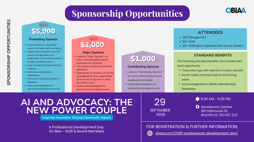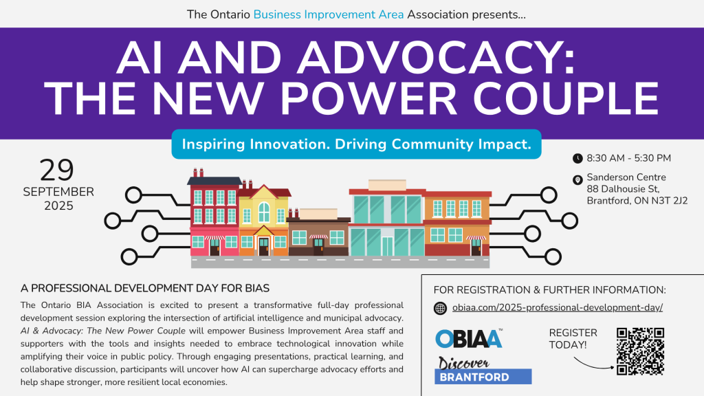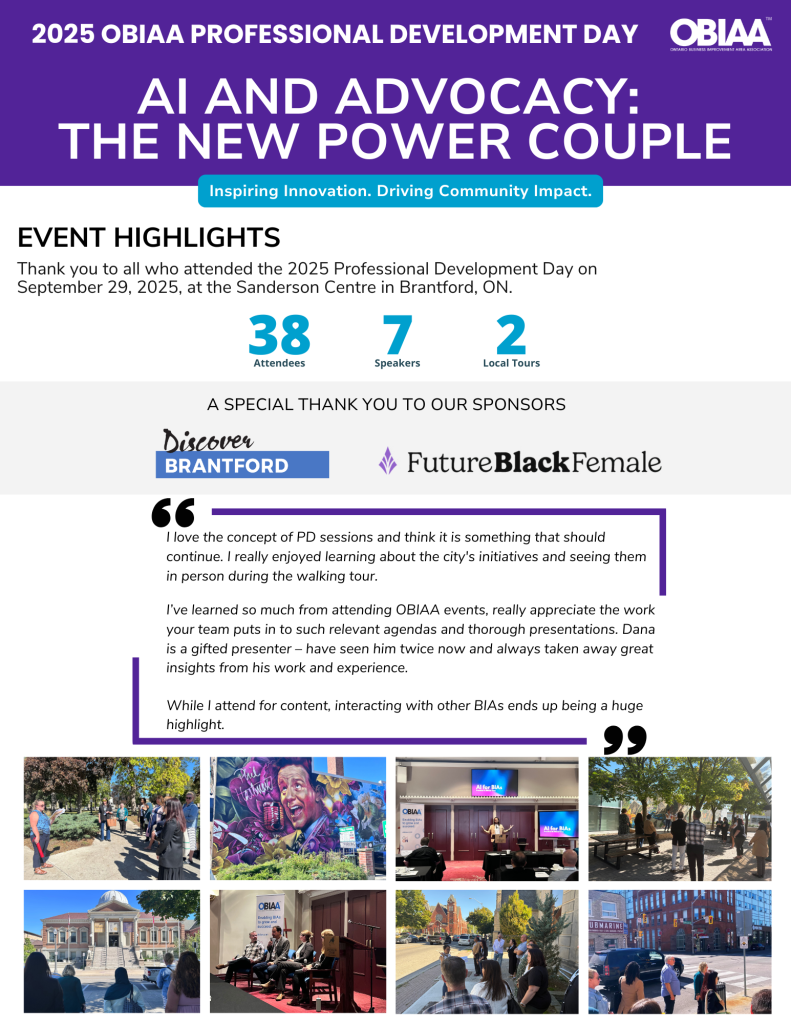 - The 2025 Professional Development Day was a transformative, full-day session that explored the intersection of artificial intelligence and municipal advocacy. This event helped to empower Business Improvement Area staff and supporters with the tools and insights needed to embrace technological innovation while amplifying their voice in public policy. Through engaging presentations, practical learning, and collaborative discussions, participants learned how AI can supercharge advocacy efforts and help shape stronger, more resilient local economies.